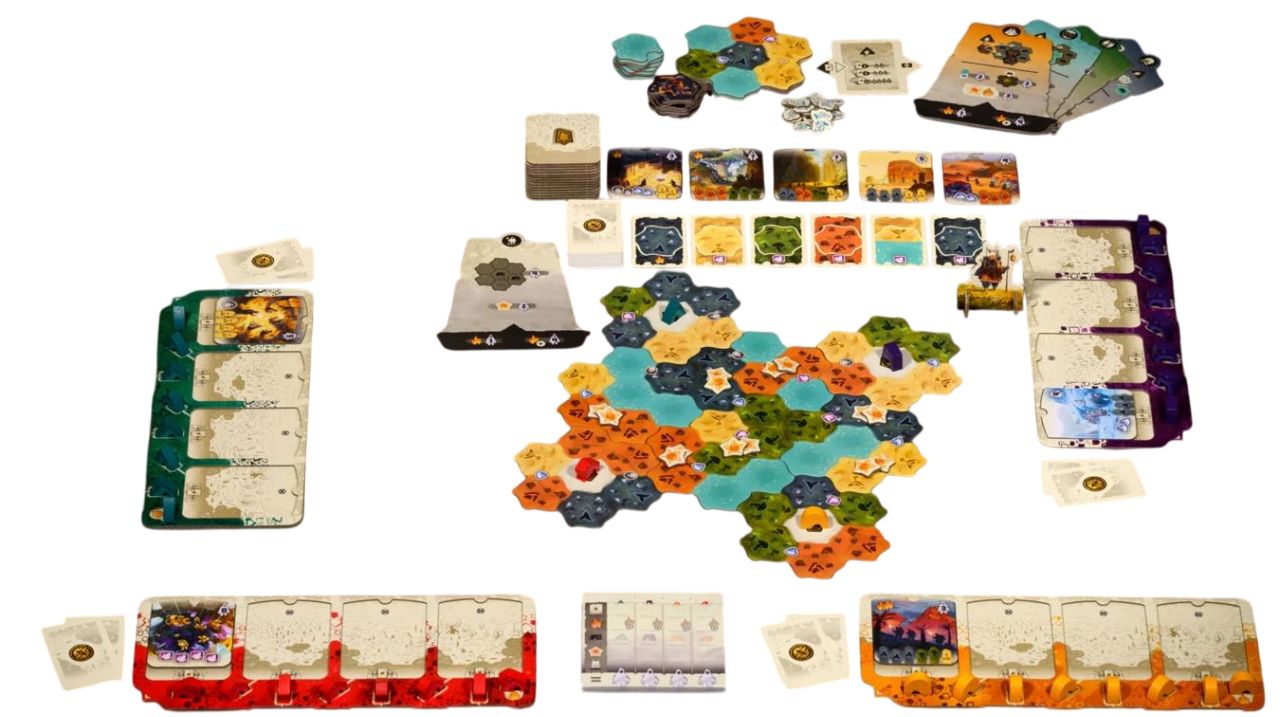 内容物:デワントークン 1枚、得点記録用紙 1冊、領域タイル 10枚、地形カード 55枚、物語タイル 24枚、シナリオタイル 5枚、ベリートークン 15枚、野営地 36個(4色各9個)、部族ボード 4枚、火山領域タイル 1枚、豪雨領域タイル 1枚、魚トークン 20枚、水域マーカー 8枚、溶岩マーカー 8枚、イベントタイル 1枚
