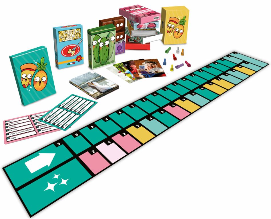 内容物:ゲームボード(得点表)1枚、カード 360枚(42枚の写真カード×8人分と計576のお題が書かれたテーマカード24枚)、フォークトークン 8個、ゲームのルール 1部