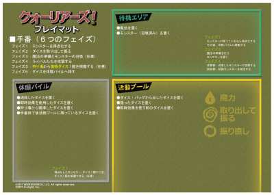 ゲームでは、ダイスを置くエリアによってダイスの状態を表す。そこで発売元のアークライト社では、オリジナルのプレイマットを公開している。下記のリンクからダウンロードして人数分を印刷する。ダイスの置き場のほか、プレイの手順、各フェイズにできることなど、簡単なレジュメも記載してあるので、ゲーム初心者にも使いやすいだろう。
