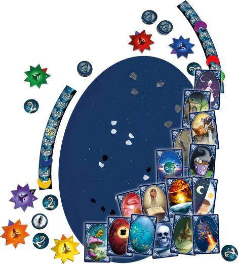 オリジナルはツォッホ出版(ドイツ)から2016年秋に発売された作品。美しいイラストの夢カード4枚がめくられ、プレイヤーは神々としてそのうち1枚「神のビジョン」を夜空に星座として星マーカーで描く。どの絵が選ばれたかは、1人以外全員が知っており、どの絵が選ばれたか知らないプレイヤー(人間)は、それが自分であることが当てられないようにする。『エセ芸術家ニューヨークへ行く』(オインクゲームズ、2011年)系統の作品だ。