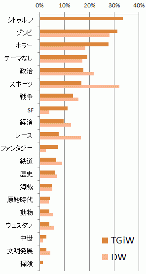 (グラフ”DW”)と比較したところ、ファンタジーと中世は確かに人気が上位だったが、それを上回る人気を集めたSFがこちらではそれほど人気がない。また、海賊、ホラー、ウェスタン、原始時代、ゾンビも欧米ほどの人気がなかった。