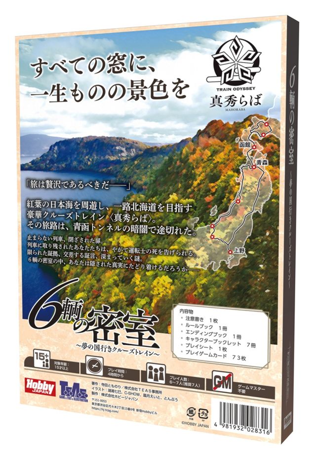 ホビージャパンは10月下旬、マーダーミステリーゲーム『6輌の密室~夢の国行きクルーズトレイン~』を発売する。ゲームデザイン:寺田とものり&株式会社TEAS事務所、6~7人用(推奨7人)、15歳以上、4時間、6160円(税込)。