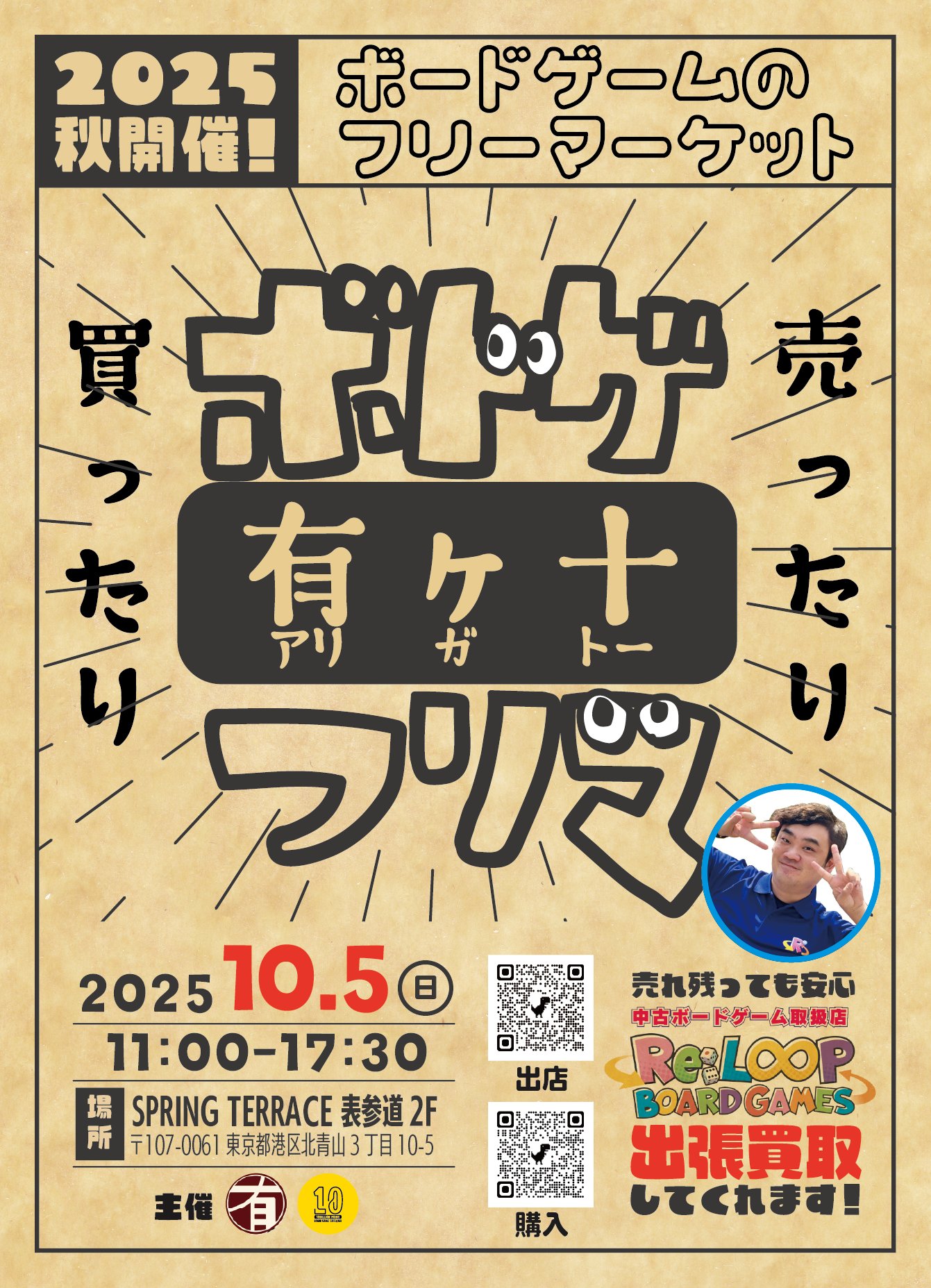 またボードゲーム中古ショップ「Re:LOOPボードゲームズ」が出店しており、出店者だけでなく来場者からも査定買取を行う(要事前申請、10月2日まで)。遊ばなくなったゲームで軍資金を得て購入に回すことも可能だ。