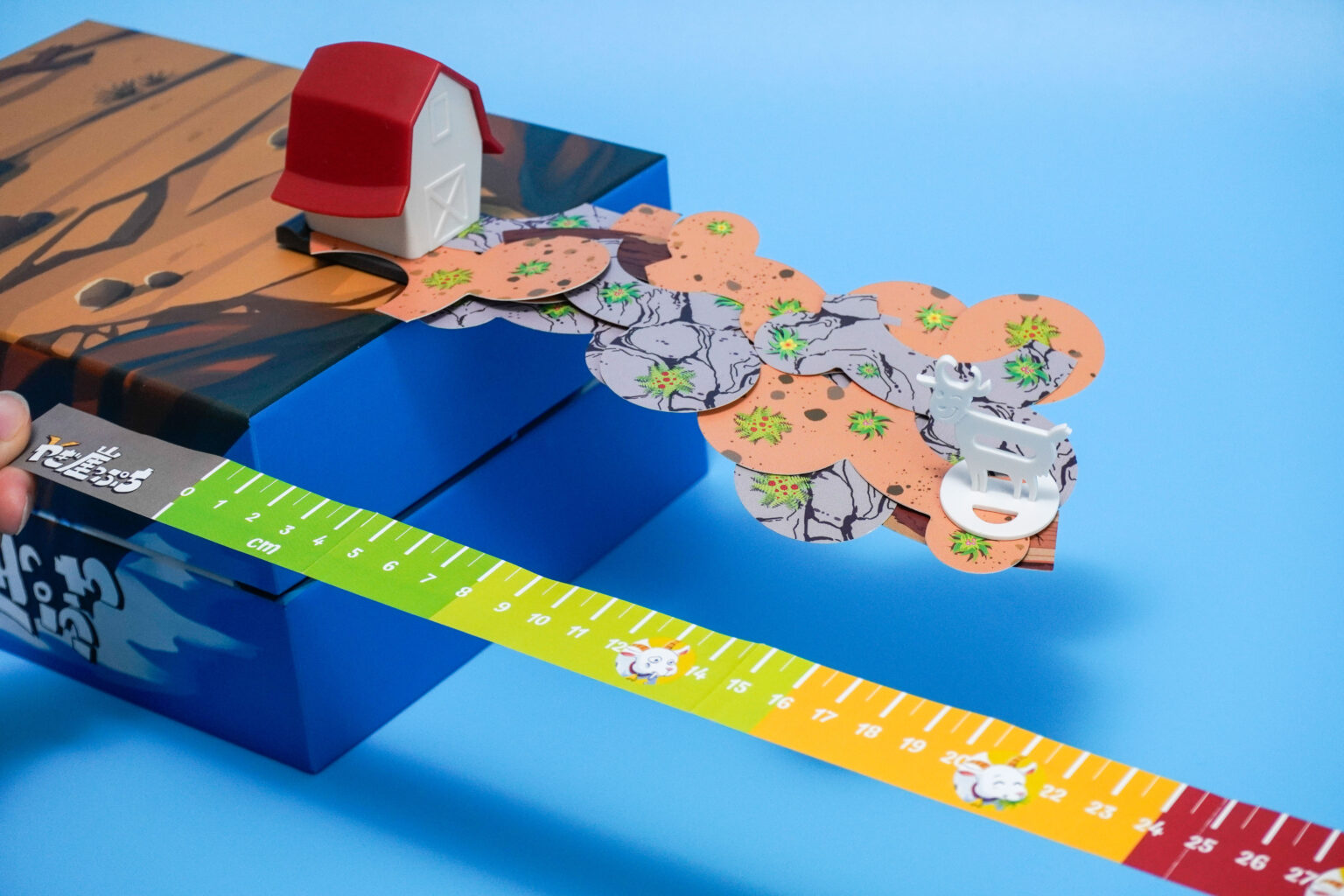 内容物:ヤギ 1個、小屋 1個、土台 1個、ミッションカード 43枚、足場パーツ 78枚、説明書カード 3枚、折りたたみメジャー 1枚