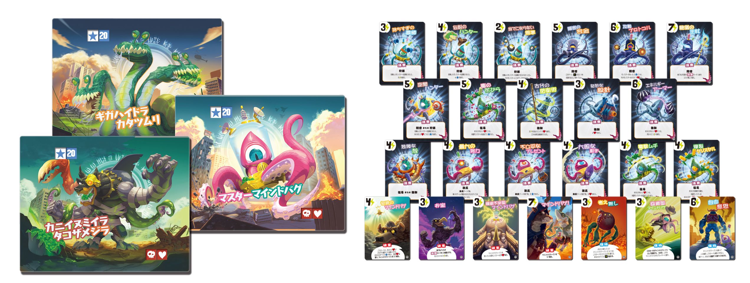 内容物:モンスターボード 3枚、モンスターフィギュア+スタンド 3組、『キング・オブ・トーキョー』用進化カード 24枚、マインドバグトークン 8枚、パワーカード 24枚、早見表 6枚、ルールブック 1冊、モンスタートークン 3つ