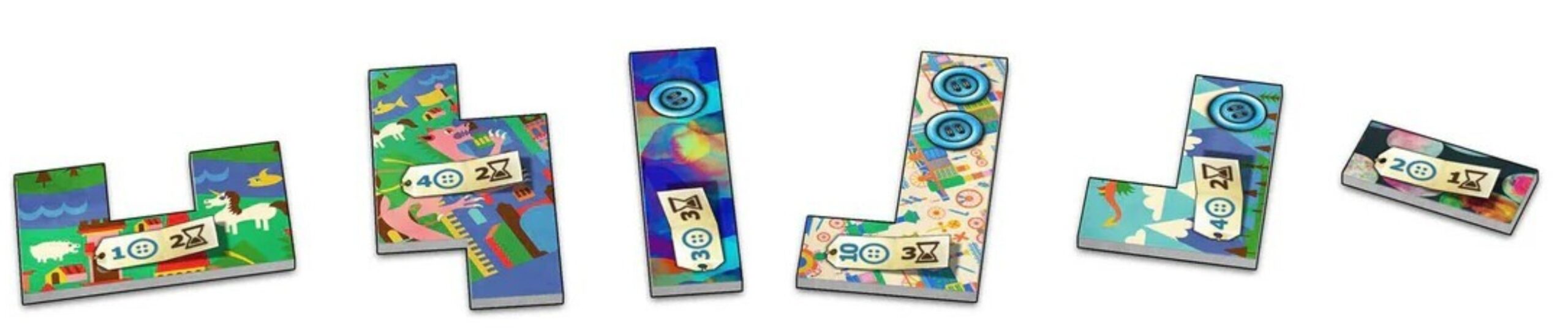 布地タイルを1枚選び、貨幣であるボタンを支払って9×9マスのプレイヤーボードに配置し、時間ボード上のコマを進める。時間が遅れているプレイヤーが先にプレイするタイムトラック方式で、連続手番もあり。パスをして時間ボードを進めるとボタンを獲得できる。ゴールしたところで、ボタンの数で勝敗を決める。