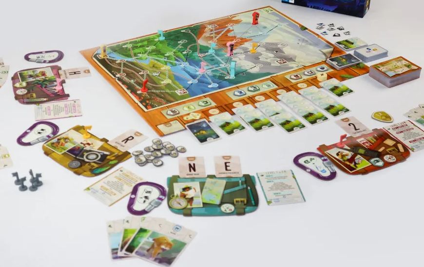 メインボードは山岳地帯がさまざまな地域に分かれており、ハイキングルートや道路、川、雪道、クライミングルートなどでつながっている。各地を手札のカードで移動して野生動物たちを観察し、個人ミッションをクリアしていく。プレイしたカードは両隣のプレイヤーに配分される「逆ドラフト」システムのため、他プレイヤーの動向にも目を配らなければならない。