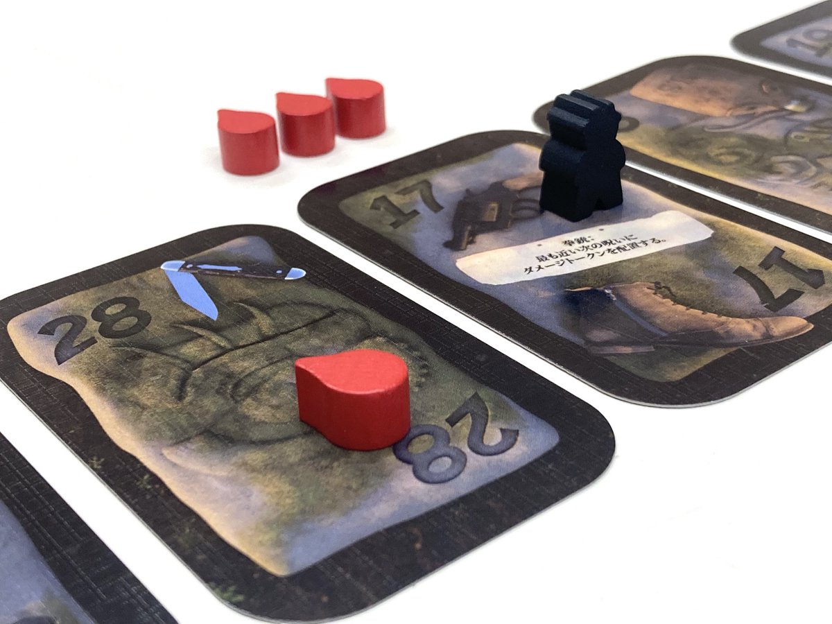 探検家の前に通路となるカードを並べてスタート。探検家は通路を進み、一番奥までたどり着けば全員の勝利となる。各自、手札から1枚ずつ同時に出して一斉オープン。小さい数字のカードのアクションにより、探検家を進めたり、次の段にある呪いを振り払ったりする。