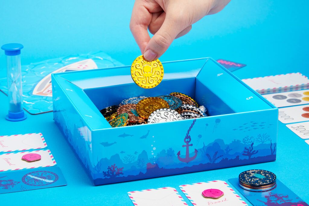視界ゼロの海中から、呪われたコインを避けて伝説のコインを拾い上げる。デザイナーは『ダレカクレタ?』『テキパキもぎもぎ』『ナルハヤのつるぎ』のましう氏。エッセン・シュピールとゲームマーケット2025秋にて先行販売された。