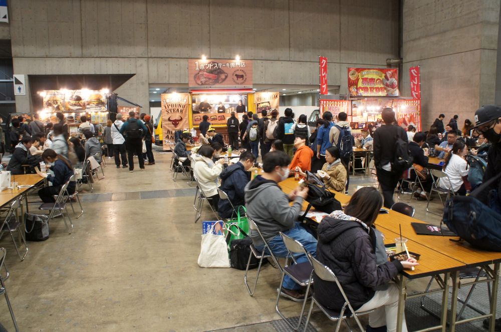 1日中歩き回っていると小腹も空いてくるというもの。幕張メッセ内にはコンビニやレストランもあるが、会場内にいい匂いが漂ってくるとキッチンカーに向かってしまう。今回はキッチンカーが3番と6番ホールの角に3台ずつ配置されており、比較的空いていた3番ホールで「焦がし醤油のキノコハンバーガー」を購入。