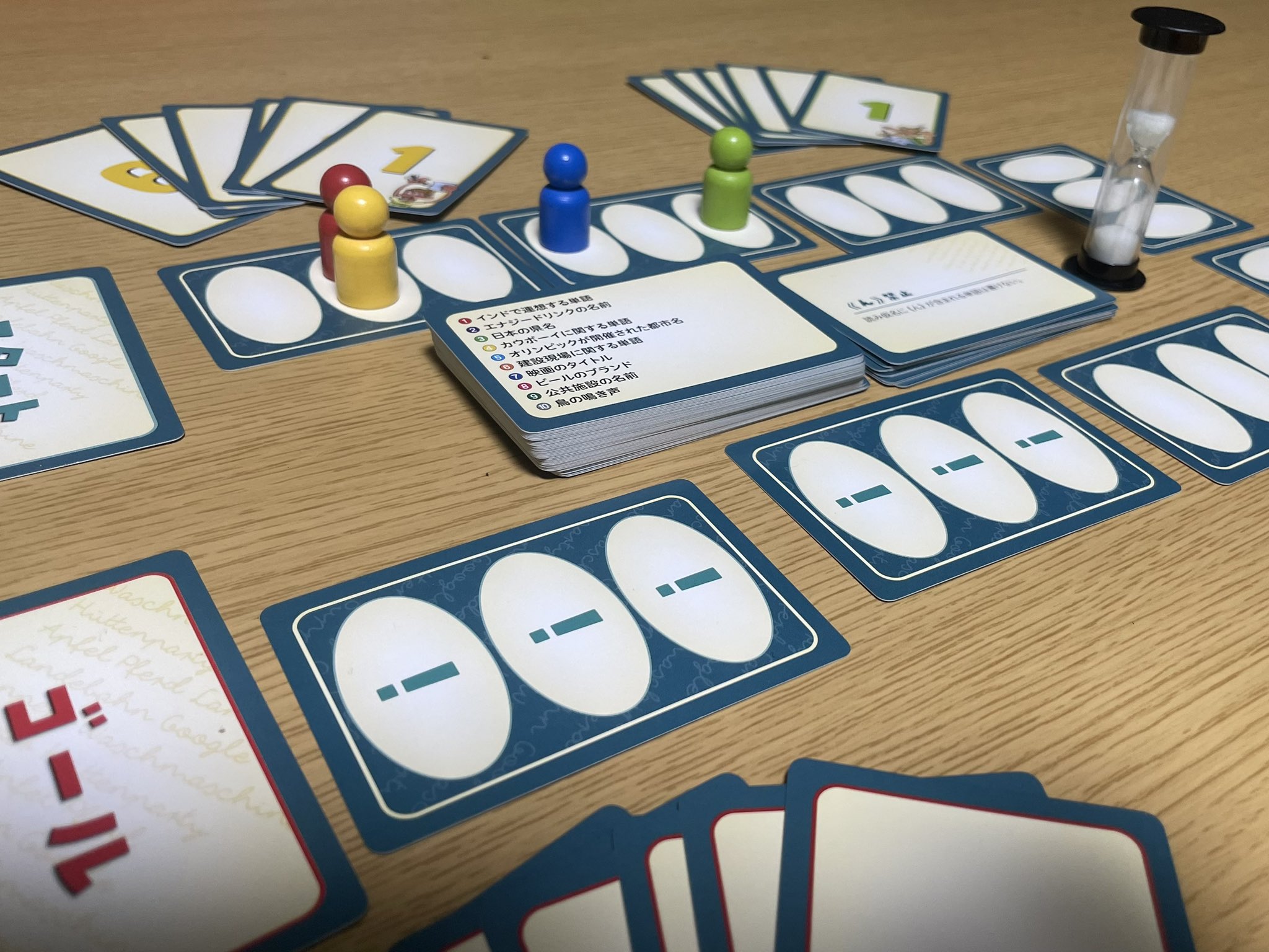 お題が発表されたら砂時計が落ちるまでに単語を書いて、いくつ読み上げられるかを宣言。宣言した数が少ないプレイヤーから発表し、宣言した分だけ発表できたらコマを進める。前のプレイヤーが発表したものは発表できないので、連想力とともに適切なビッドも問われる。