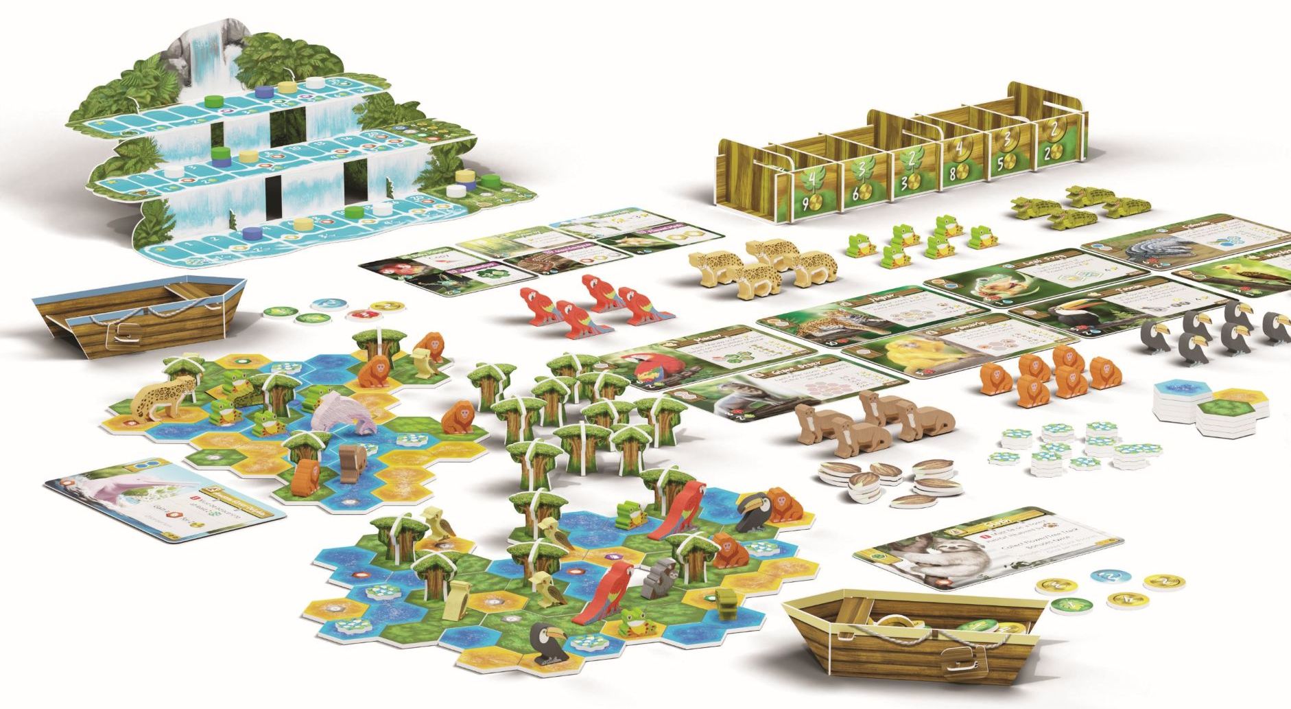 シルクスクリーン印刷の動物トークン、滝を模した得点ボード、立体的な樹木のコマなど、熱帯雨林の雰囲気を生み出す豪華なコンポーネントも特徴。動物ごとに4パターンから得点方法を変えて繰り返し遊ぶことができる。短時間ルールや、難易度の選べる1人用ルールも用意されている。