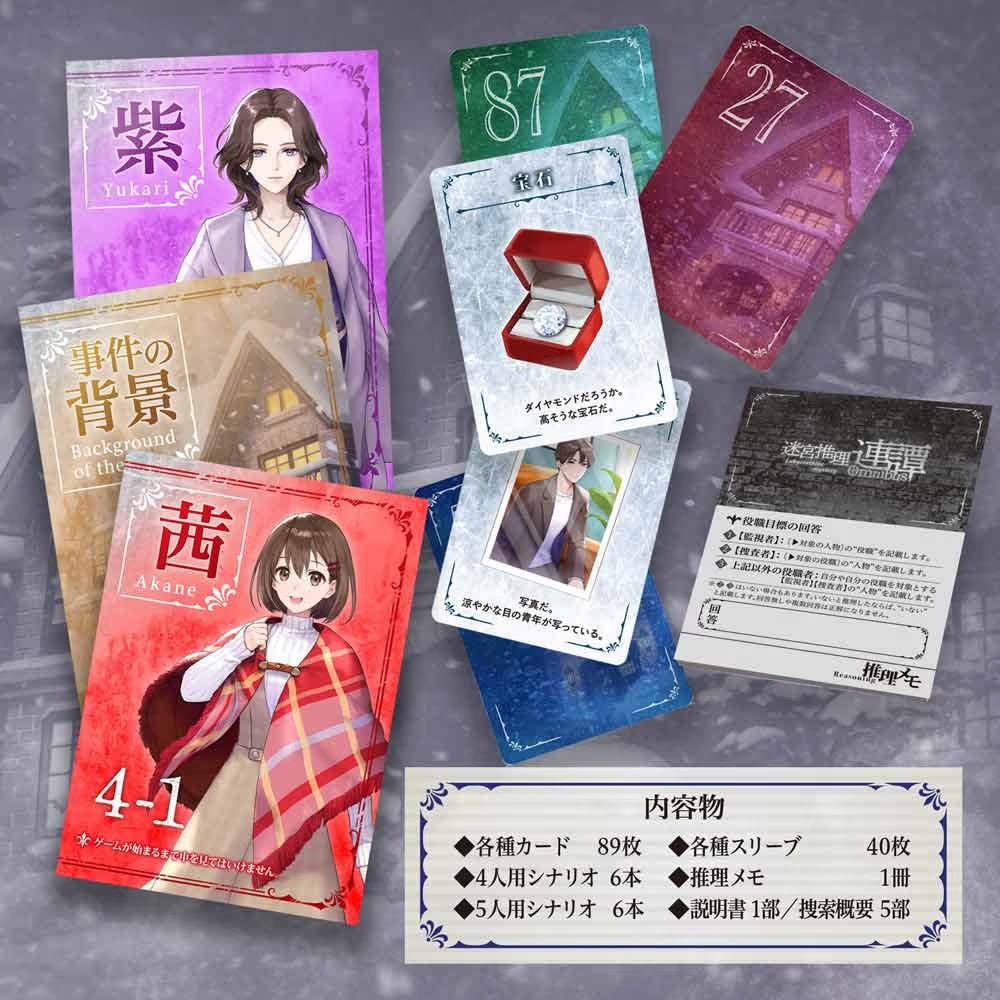 内容物:各種カード 89枚、各種スリーブ 40枚、4人用シナリオ 6本、5人用シナリオ 6本、推理メモ 1冊、説明書 1部、捜索概要 5部