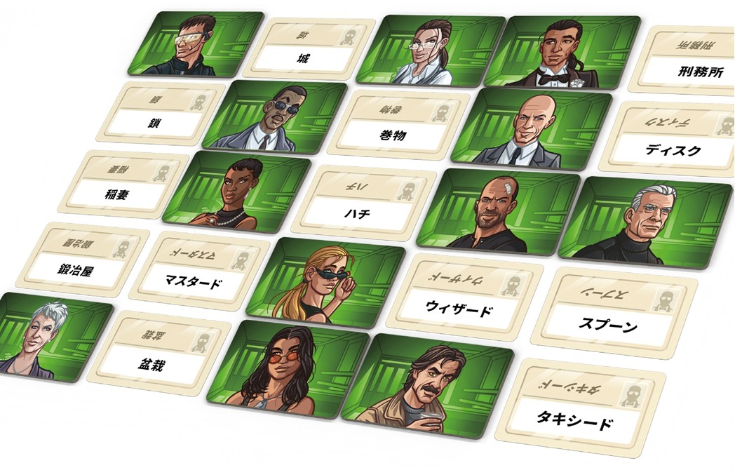 内容物:ワードカード 200枚(全400語)、緑のエージェントタイル 15枚、時間トークン 11枚、暗殺者タイル 1枚、両面印刷のキーカード 60枚、カードスタンド 1個、ルールブック 1部