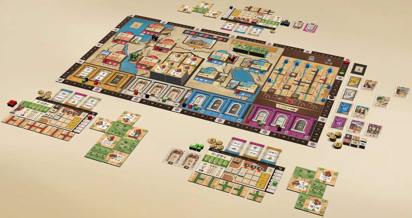 デリシャスゲームズ(チェコ)から昨秋発売されたゲーマーズゲーム。西暦3世紀の中東で栄えた都市レサファで、商品を売買すると共に、水路、工房、庭園を建設して勝利点を競う。