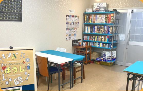 帽子を始めとする刺繍加工会社「ボウシ.コム」が、閑散期である冬にオフィスの約3分の2を開放して設けたプレイスペース。商店街の中にあるアットホームな遊び場で、初心者から上級者向けまで110種類のボードゲームを揃える。