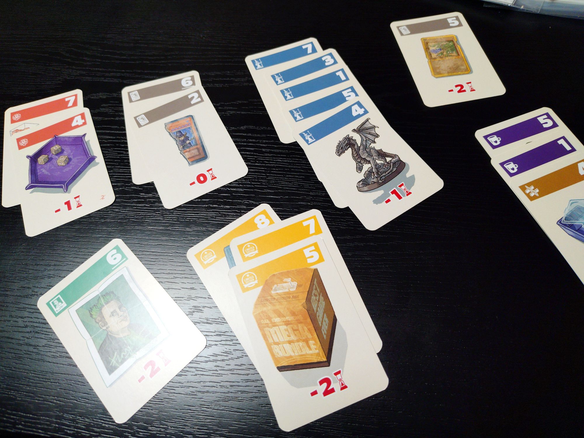 6ラウンド(エッセンシュピールは4日だが)でゲーム終了。最後まで出せなかったカードは、特殊カードも含めて失点で、出したカードの素点と、同種3枚以上集めたアイテムのボーナスを足して得点を競う。