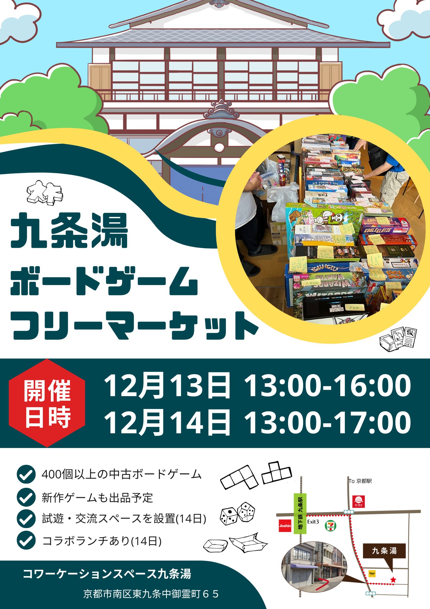 10組が持ち込んだ500~600点の中古・新作ボードゲームが出品される。14日は農家と高校生のコラボランチが販売され、終了後20:00まで試遊・交流スペースが解放される。