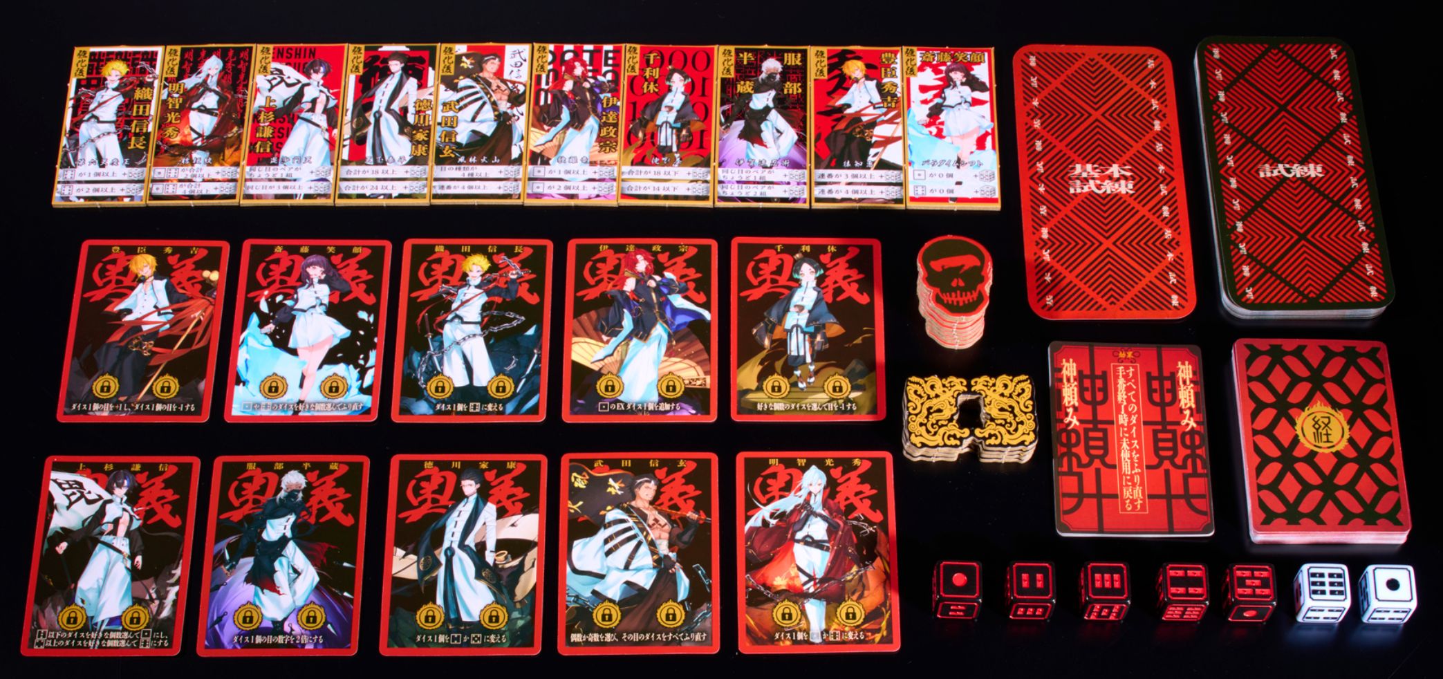 織田信長、明智光秀、豊臣秀吉など、能力が異なる10人の戦国武将から1人を選んで戦う。「ダイスの合計値が○○以上」「偶数が○個以上」などの試練カードの数値をギリギリまで上げながら、その試練をクリアしていく。手番の度に試練の難易度を上げていき、ただ一人の生き残りになれば勝ち。