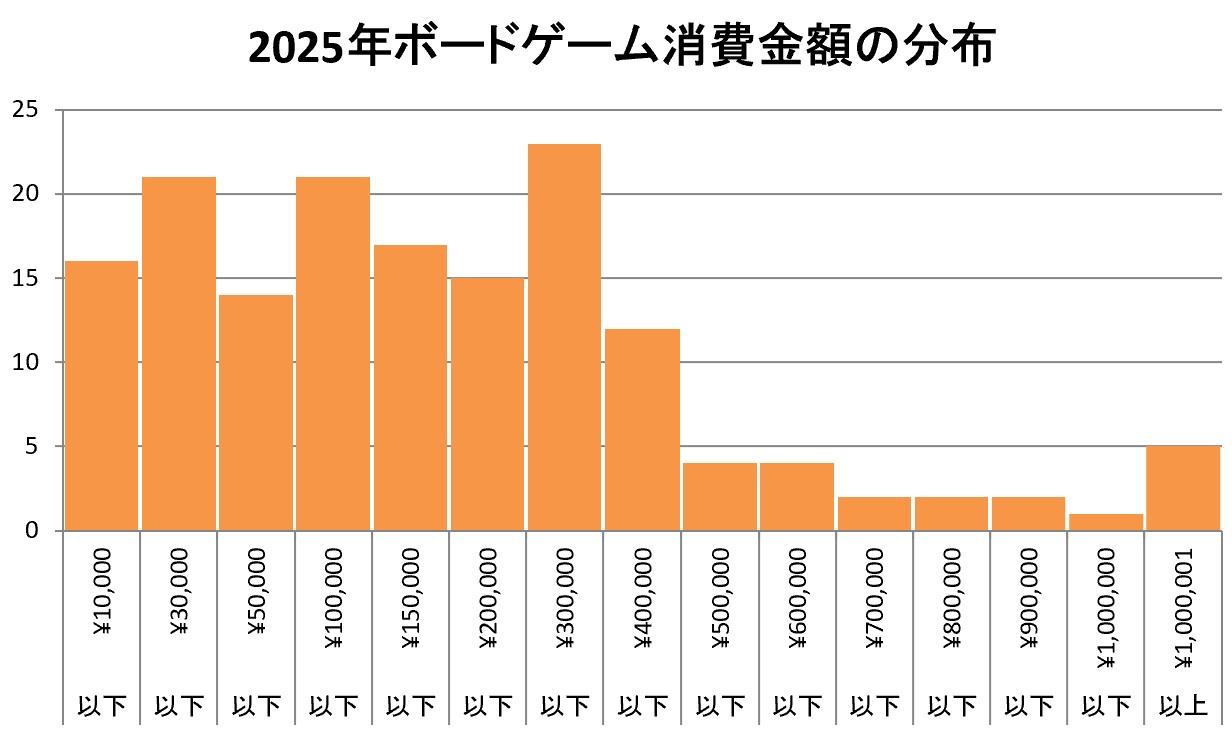 「オタク」に関する消費者アンケート調査(矢野経済研究所)の「アナログゲーム」(年間8987円)とは大きな開きがあり、回答者層に偏りがあるが、ボードゲームを趣味とする愛好者のうち、上位層のデータとして参考にして頂きたい。なおこの金額は「20代が趣味や遊びに使っている金額」(SMBCコンシューマーファイナンス)の平均額と同じであり、家計的にあり得ない数字ではない。