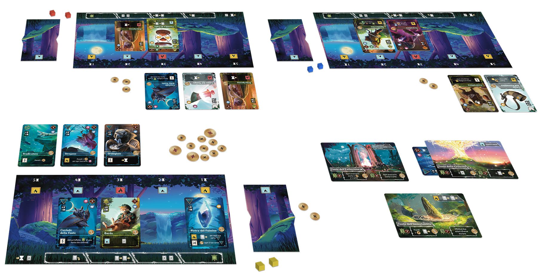 勝利点マーカーがなくなる、誰かの仲間が12枚になるなどの終了条件を満たしたラウンドでゲームが終了し、勝利点で勝敗を決める。カードの強さによって異なる時間差を調整して、シナジーを組み立て、他プレイヤーより先に「源泉」を征服できるか。幻想的なイラストが並ぶ緊張感のある戦いが待っている。