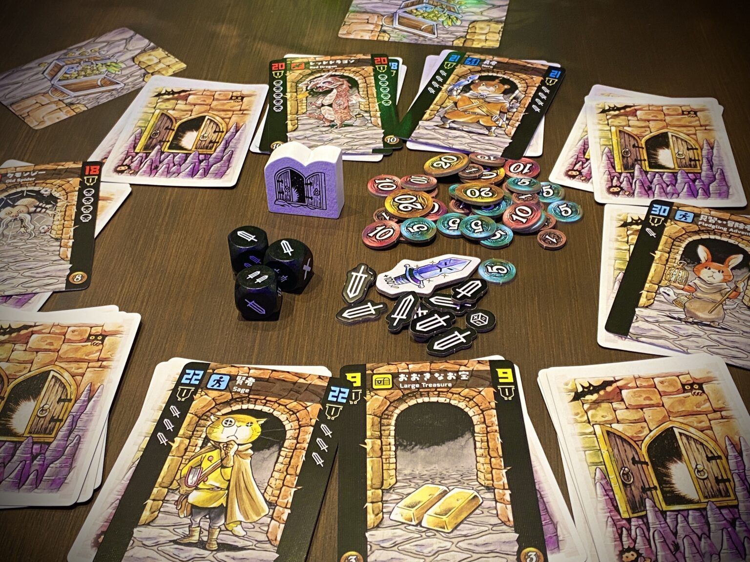 カードには勇者とモンスターがあり、勇者の戦闘力(剣)の合計がモンスター(ドクロ)を上回ればお宝を獲得できるがモンスターのほうが強ければ0点。見切りをつけて早めに抜けるか、最後まで粘って探索するかはプレイヤー次第だ。
