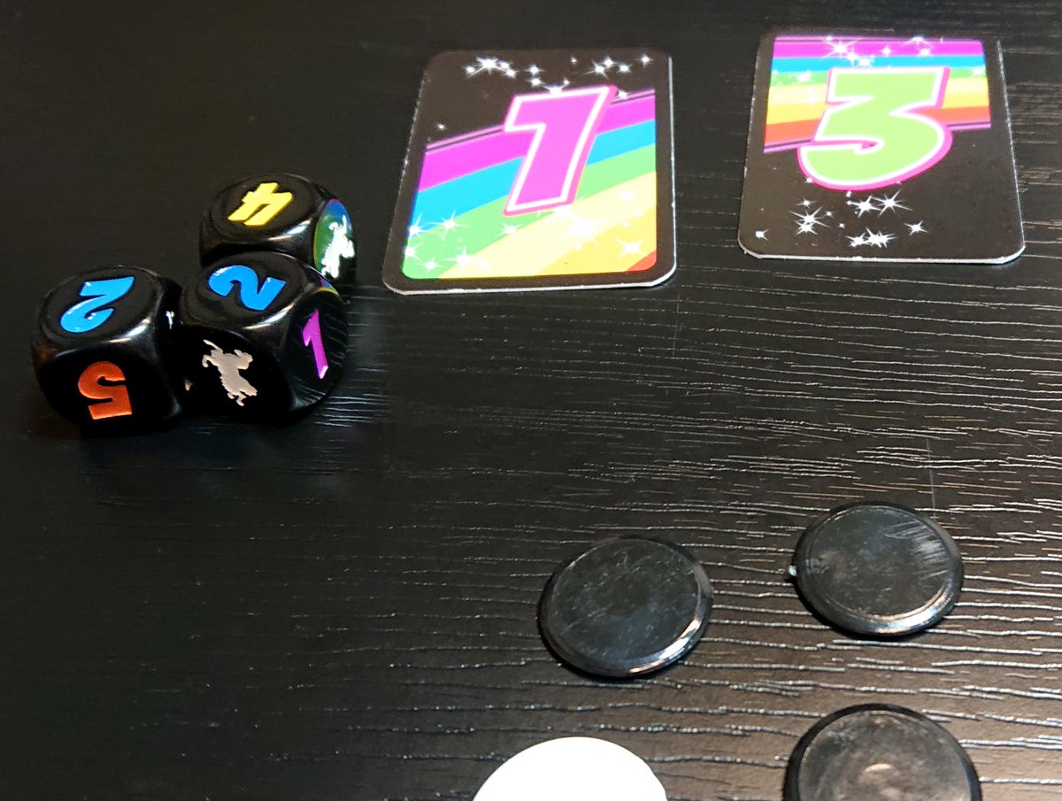カードは1~6とラマがあり、ランダムに6枚配られる。手番には3つダイスを振り、自分の前にあるカードと一致すればそのカードを捨てられる。全部捨てられれば無失点で一番いいわけだが、ダイスがそんなに都合よく出てくれるわけはなく、カードが少なくなるほど成功する確率は低くなる。ダイスの出目で持っているカードがないと、中央の場札を引き取って一旦バーストを回避できるが、場札にもその出目がないとバースト。残った場札を引き取って強制終了となる。