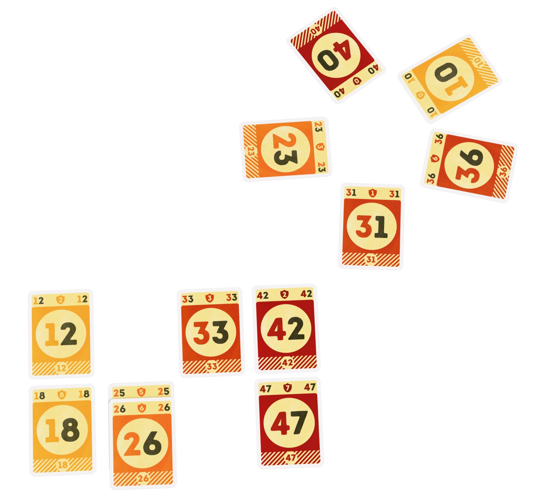 3ラウンドの合計で勝敗を決める。小さい数字はうまく連番を作って消し、大きい数字で得点を狙いたいところだが、獲得したカードは自分の前に並べられており、他のプレイヤーはそれを見て大きい数字が連番になるようカードを出してくる。危機回避能力が試される緊迫感に満ちたカードゲームだ。2対2で合計得点を競うチーム戦も可能。