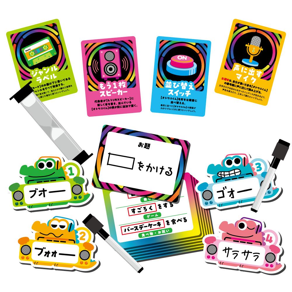 内容物:お題カード 44枚、激ムズお題カード 6枚、自由お題カード 1枚、ヒントカード 4枚(カードサイズ 63×88mm)、オトワニくん 6枚、もう1枚スピーカー 1枚、ペン 6本、砂時計(1分)1個、カードスタンド 1個、ボードスタンド 7個、ルール説明書 1枚
